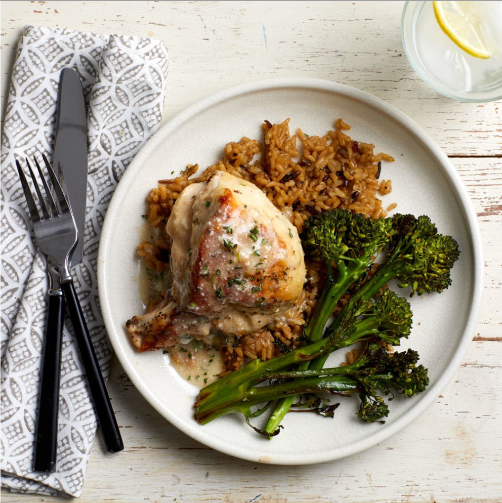 A store-bought rice blend and quick-cooking chicken breast help get this healthy chicken recipe on the dinner table fast. Other herbs, such as rosemary and sage, are also delicious in this recipe.