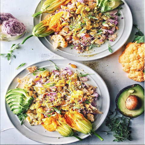 Homemade raw shaved purple salad with yellow cauliflower tossed with truffle oil, crushed pistachio, golden raisins, micro cilantro, avocado and squash blossoms.