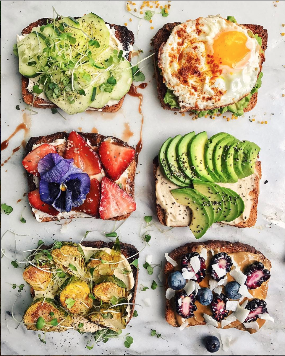Homemade Cream Cheese toats: From top right: dairy free cream cheese + cucumber, avocado + egg, hummus + avocado, almond butter + berries, hummus + Brussels, cream cheese